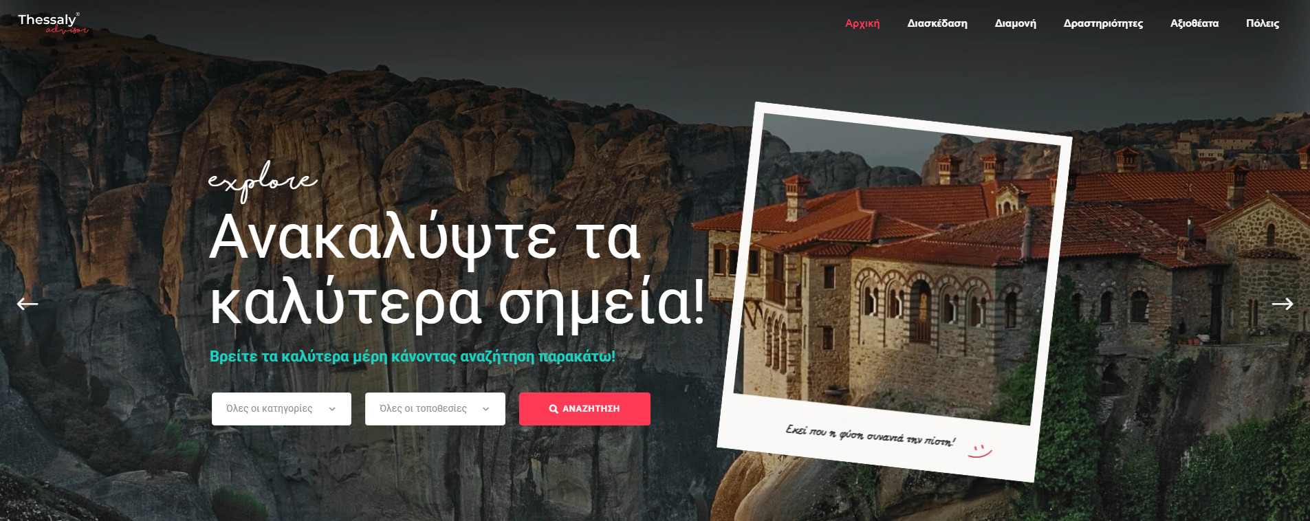 Στον ThessalyAdvisor.gr θα βρεις τις καλύτερες επιλογές για όλες τις κατηγορίες που θα κάνουν τη διαμονή και την εξερεύνησή σου στη Θεσσαλία μοναδική: